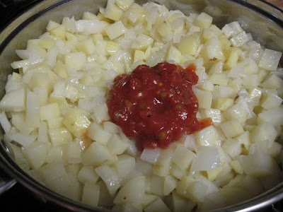 Dump the potatoes and onions in a pan to saute with a little oil..I'll do a little less onions and a little larger potato pieces next time. This is the longest part of the cooking process - took about 10 minutes for the onions to cook down and the potatoes to start getting soft.